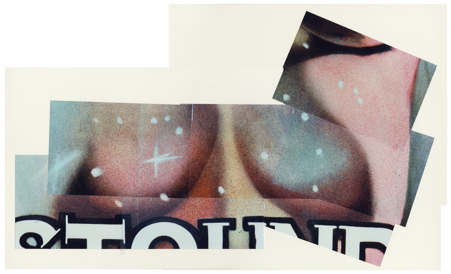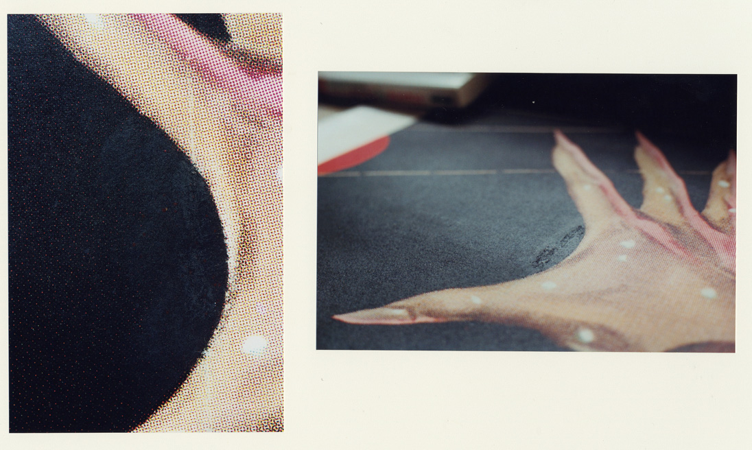 You can see from this image (a composite of photos) - the huge amount of respray all over the chest. You can see how the poster was originally printed by the grid like printing around the edges of this image, like in between the text, and the obvious spray elsewhere. The greyish white spot at extreme right was covered by plastic tape!, presumably as a left over from the respraying, which I have since removed. Looking now at the photo of this poster Debi sent me during early discussions, I can now see that the dark tape on that spot was visible in it! (I would include the image here, but I don't want to do anything wrong such as infringing copyright on her image...) If Debi has lost her original image, I will happily email it to her. |